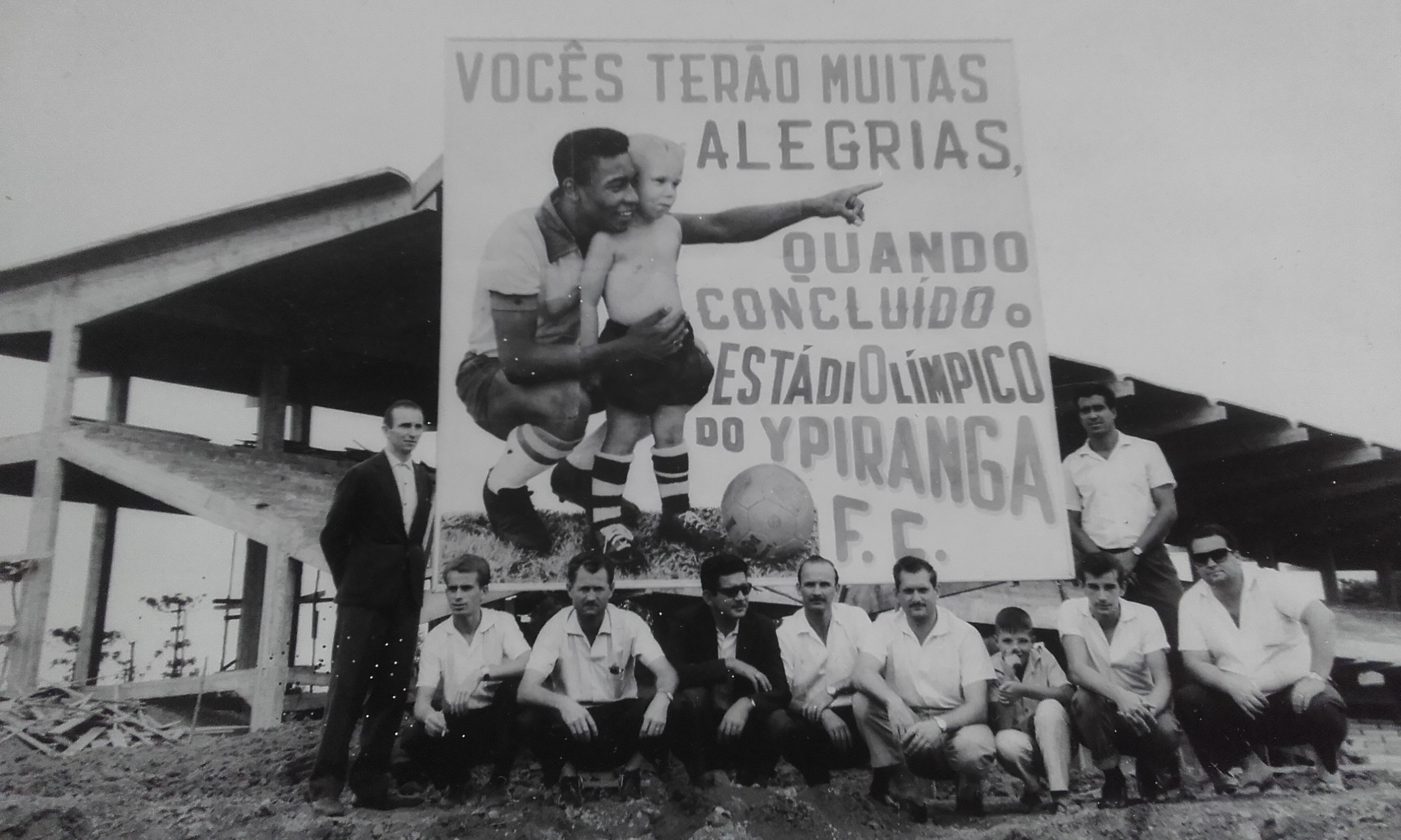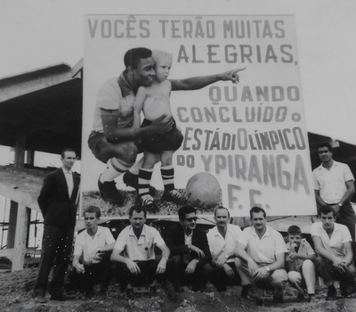 A leitora Josie Isotton enviou a foto que registra a construção do estádio Colosso da Lagoa, com a imagem de Pelé no apelo publicitário.
