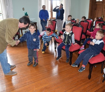 Duas turmas do pré A 1 e 2 da Escola Municipal de Educação Infantil Lucas Vezzaro estiveram na prefeitura, para uma audiência com o prefeito Luiz Francisco Schmidt, relacionada aos 99 anos de Erechim. Acompanhados das professoras Luciana Grzibowski, Ivani Vidal, Maria Zin e a Coordenadora Pedagógica Taise Bayon, os alunos foram recepcionados no salão nobre, onde receberam as boas-vindas e um bombom para cada visitante.