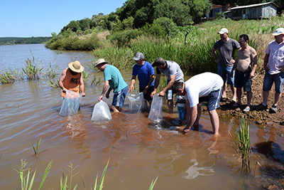 Moradores das margens do lago da barragem do Rio Passo Fundo, na região da Estrada da Carreta Quebrada, no município de Quatro Irmãos, ´promoveram a soltura de 5 mil alevinos de jundiá e 500 alevinos de lambaris como ação de repovoamento com espécies nativas. São cerca de 20 moradores de uma faixa de terra pertencente à Família Dhaubermann, centenária proprietária naquela região, que no início do século 20 era trajeto de ligação de Passo Fundo com o Goio-En, na travessia do Rio Uruguai.