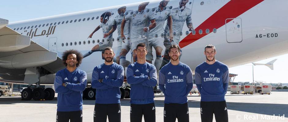 Também patrocinadora do Milan, Arsenal e Paris Saint Germain, quando o assunto é futebol, a Emirates não poupa recursos. O contrato com Real Madrid é o maior entre os times patrocinados pela companhia aérea e atinge 40 milhões de euros por ano. Fundada em 1985 e com sede em Dubai, a Emirates foi escolhida pelo quarto ano consecutivo a melhor empresa do segmento no mundo, segundo eleição promovida pela Skytrax. O patrocínio esportivo é o pilar mais importante da comunicação da Emirates. A empresa foi parceira da Fifa de 2006 a 2014, dá nome ao estádio do Arsenal, patrocinou dois dos eventos de tênis mais importantes do planeta (US Open e Roland Garros) e mais de 20 torneios de golfe pelo mundo, além de ter fechado contrato para as Copas do Mundo de Rugby de 2015 e 2019.