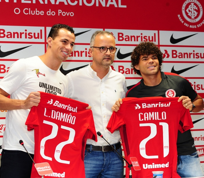 O Internacional apresentou dois reforços de uma só vez no final da tarde de ontem (24), no CT do Parque Gigante. O meia-atacante Camilo e o atacante Leandro Damião foram oficialmente anunciados como jogadores do clube em entrevista coletiva para a imprensa. A dupla ainda não está regularizada no BID e, portanto, não estará à disposição para a partida contra o Oeste-SP, nesta terça-feira, no Beira-Rio.