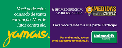 A Unimed Erechim aderiu à campanha “10 Medidas Contra a Corrupção”, realizada pelo Ministério Público Federal (MPF). O Projeto de Lei de iniciativa popular quer aprimorar a prevenção e o combate à corrupção e à impunidade. Em apoio à iniciativa, a cooperativa médica criou uma ação de comunicação com slogan “Você pode estar cansado de tanta corrupção. Mas de lutar contra ela, jamais” para incentivar cooperados, colaboradores, beneficiários, prestadores, fornecedores e sociedade local a participarem da mobilização. Listas de apoiamento estão disponíveis nos locais de atendimento da Unimed. A meta do MPF é coletar 1,5 milhão de assinaturas.
