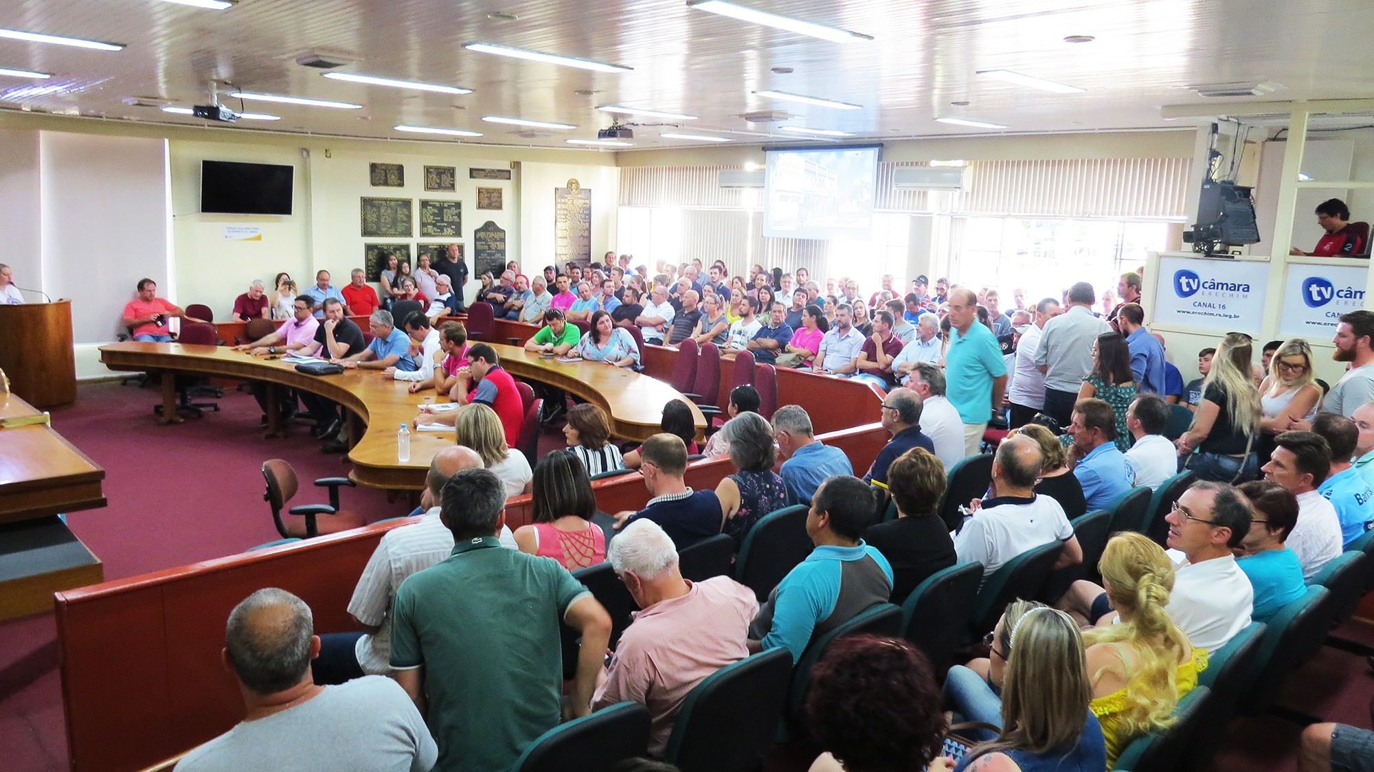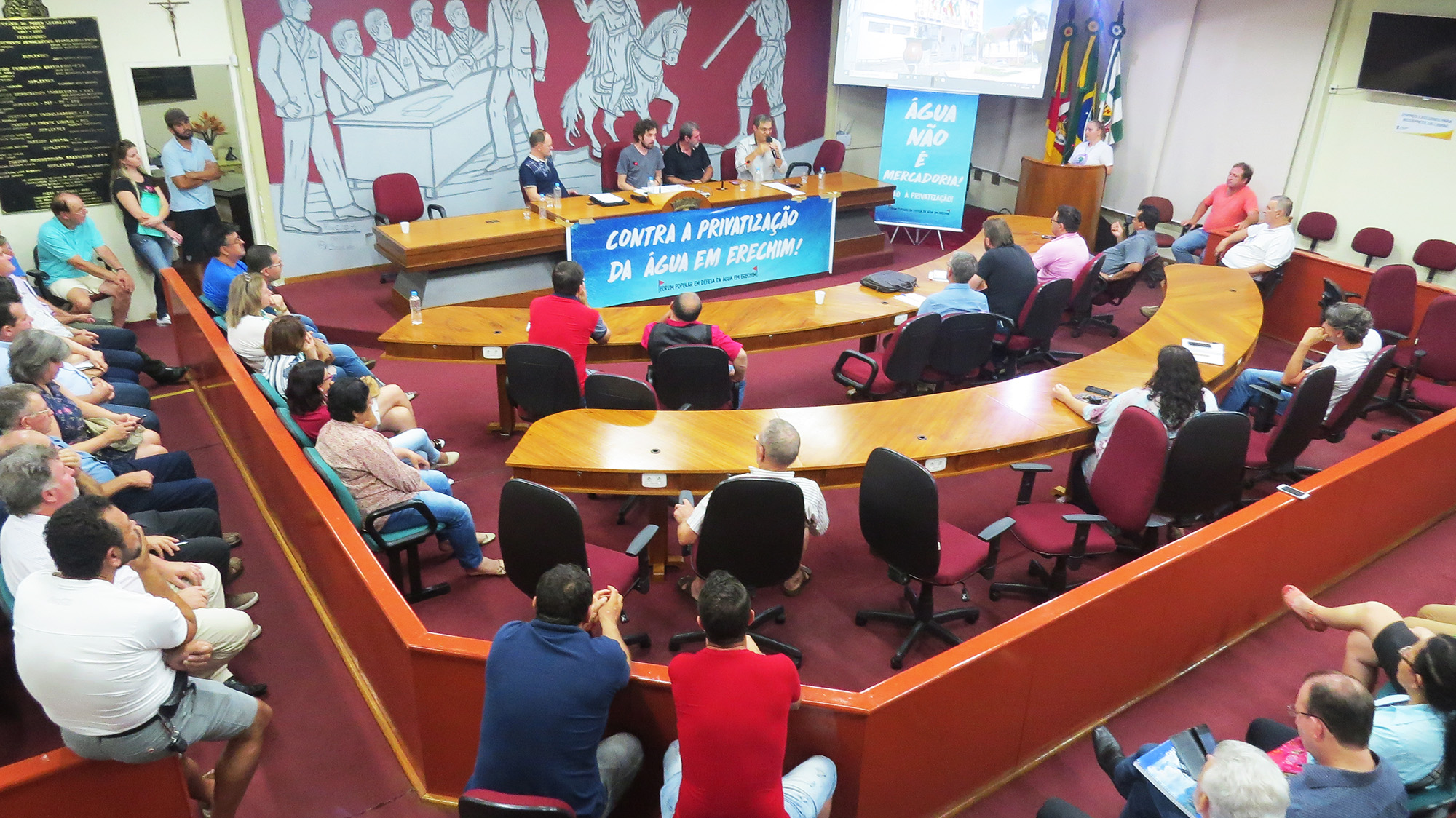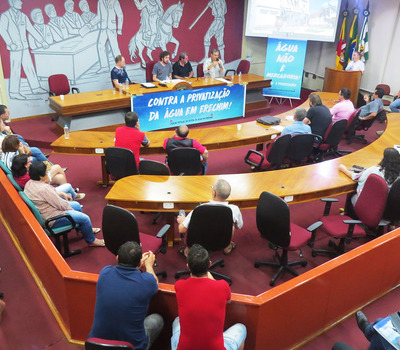O Fórum Popular em Defesa da Água realizou ontem à noite (9) na Câmara de Vereadores de Erechim lotada, seminário para discutir o edital de concessão dos serviços de água e esgotamento sanitário. O debate durou quase três horas e definiu em carta que será entregue à prefeitura de Erechim na quinta-feira (11) às 14 horas e também ao Ministério Público pela suspensão do edital que está marcado para o dia 16 de janeiro às 8h30min. A prefeitura foi convidada a participar para explicar o certame, porém não encaminhou representante e menos de três horas antes emitiu uma nota de esclarecimento sobre o assunto em questão, sendo a resposta oficial a qualquer evento público.