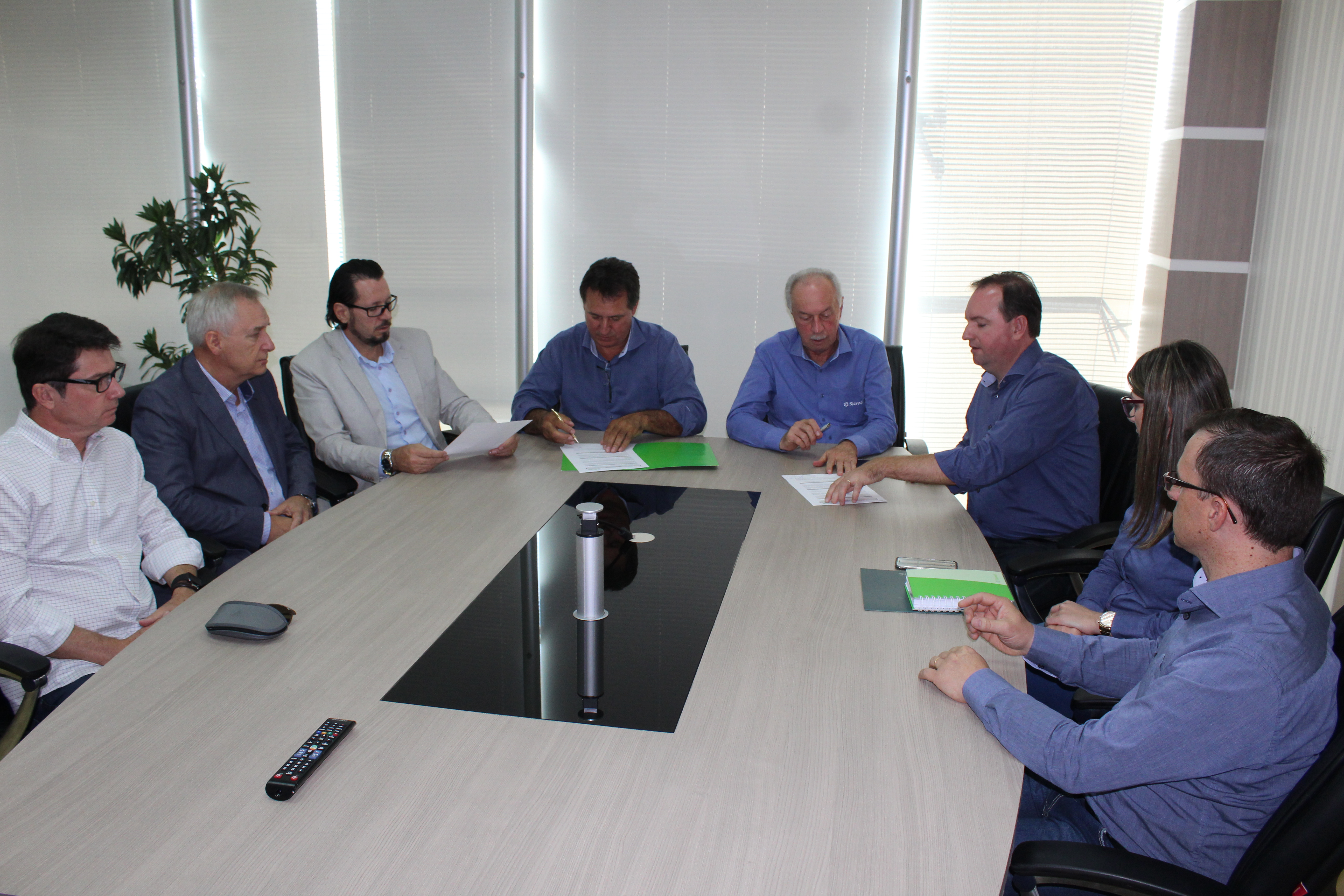A Associação Comercial, Cultura e Industrial de Erechim e a Sicredi Norte RS/SC firmaram uma parceria que auxiliará as empresas do município no âmbito do crédito. A assinatura do Convênio de Cooperação, que disponibilizará linhas de crédito com as menores taxas de mercado, além de produtos e serviços ofertados e disponíveis no portfólio da Sicredi Norte RS/SC, foi realizada nesta quinta-feira (8), na sede da superintendência regional. Participara da assinatura o presidente da ACCIE, Fábio Vendruscolo; do vice-presidente Roland Koller; do diretor administrativo, Alexandre Zaffari; do presidente da Sicredi Norte RS/SC, Adelar José Parmeggiani; do vice-presidente Adelino Reovaldo Loch; do gerente da Agência Erechim Centro, Volmir Pasa; da gerente da Agência Praça Jayme Lago, Morgana Zin; e do assessor de desenvolvimento, Leandro Marangoni.