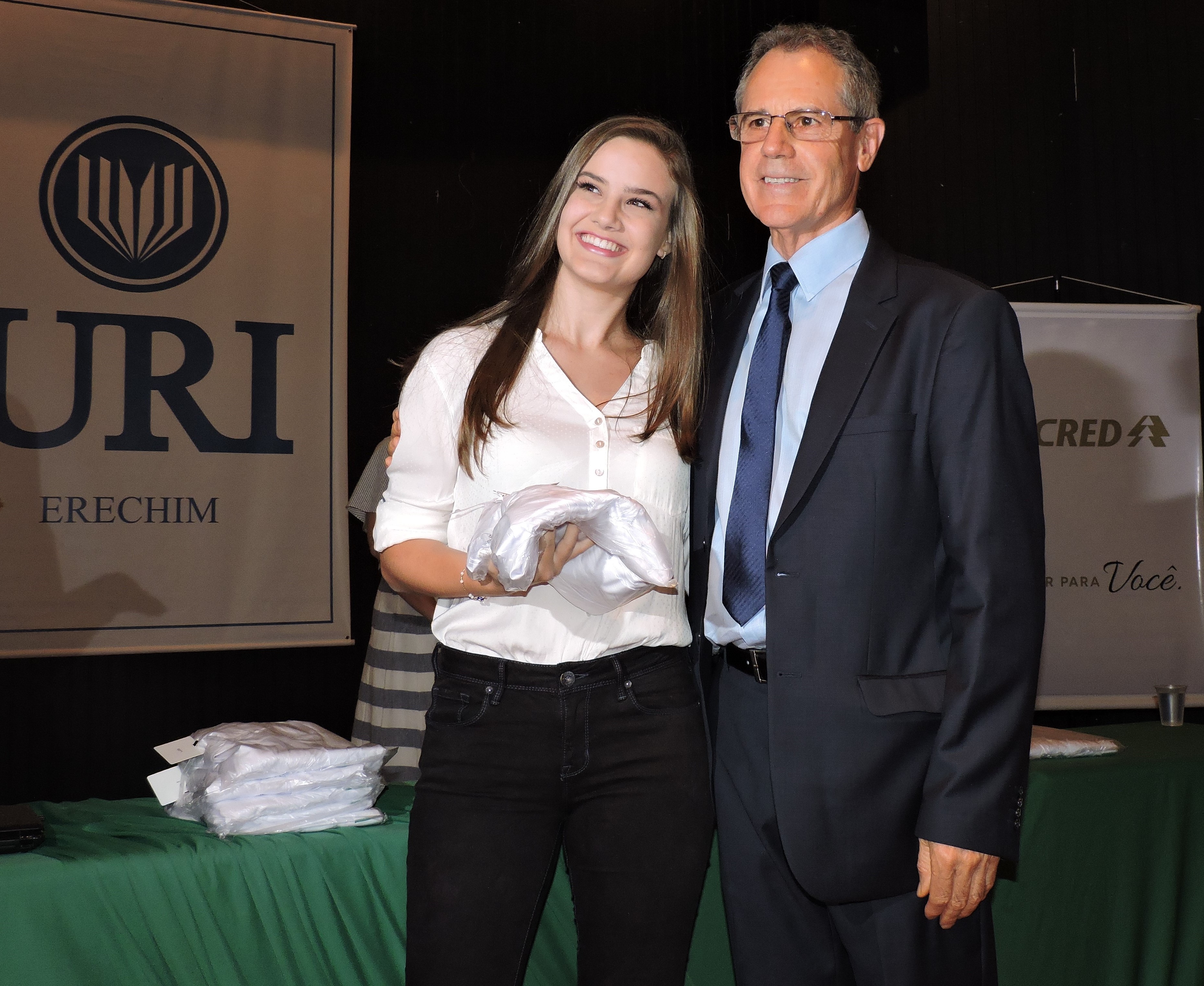 A URI Erechim, em parceria com a Unicred, promoveu, nesta sexta-feira (16), a cerimônia de entrega de jalecos aos calouros da primeira turma do curso de Medicina da universidade. O evento foi realizado no salão de atos e prestigiado pela diretora acadêmica, professora Elisabete Maria Zanin;coordenador do curso, professor Sérgio Bigolin;supervisora pedagógica, Miriam Wilk Wisniewski; diretor-presidente da Unicred, Antônio Gabriel Teixeira; gerente geral da Unicred, Vânia Bez Balestrin, estudantes, pais, professores e convidados.