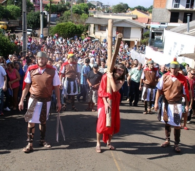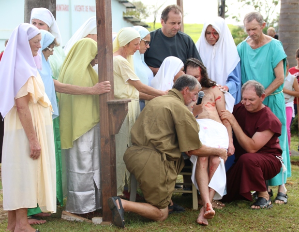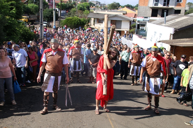 A representação da Paixão de Cristo desta Sexta-feira Santa (30) iniciou no bairro linho, e contou com a presença de centenas de fiéis acompanhando a procissão que seguiu em direção à Capela Nossa Senhora Aparecida, onde foi realizada a cena da crucificação de Jesus.