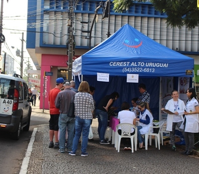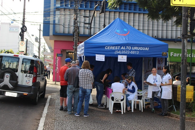 A Secretaria de Saúde (SMS), em parceria com o Centro de Referência Regional em Saúde do Trabalhador (CEREST), realizou, nesta quarta-feira (2), uma ação de promoção e prevenção em saúde no centro da cidade, na chamada esquina democrática (Av. Maurício Cardoso com a Rua Itália).
