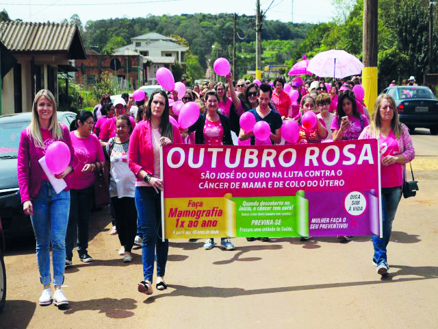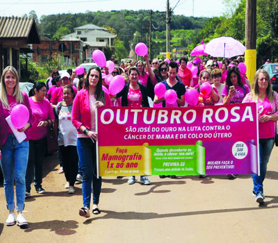 Mulheres de São José do Ouro realizaram no dia oito a caminhada pela prevenção ao câncer de mama. A saída foi em frente ao posto de saúde do centro da cidade até o Centro Cultural Danúncio Andreani. A tarde foi de muita diversão e de comoção ao mesmo tempo. Após assistirem a apresentação do grupo Aldeia Teatral com a peça "Mulheres blá, blá, blá", o público presente ouviu o depoimento de Rosane Poletto e Jussara Bragnolo Bernardi que tiveram câncer de mama. Também, em frente ao Centro Cultural alunos do curso de enfermagem da Fargs realizaram exames gratuitos aos participantes. O evento foi organizado pelas secretarias municipais, de Saúde, de Educação e de Assistência Social com o apoio de entidades locais.