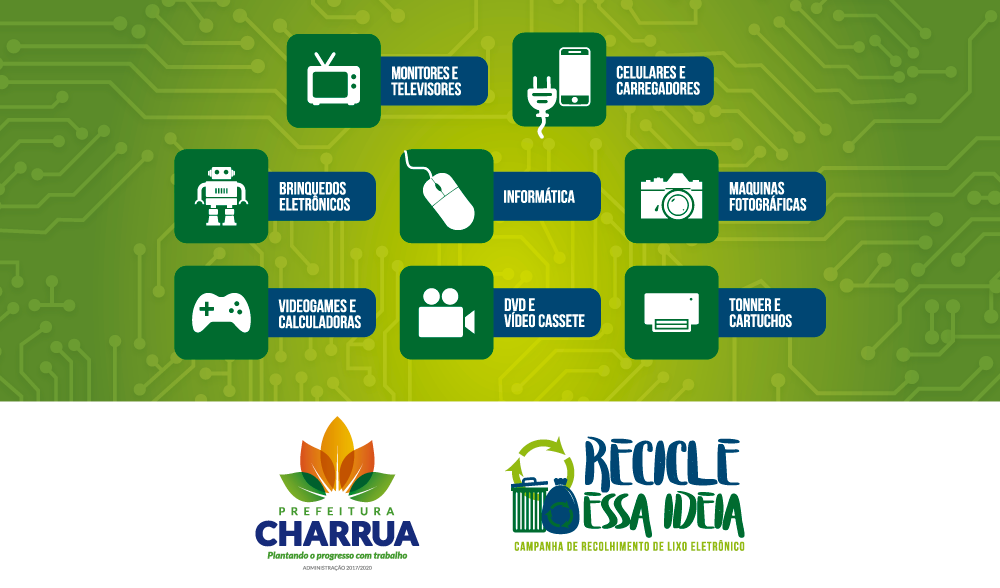 A segunda edição da campanha de recolhimento de lixo eletrônico, “Recicle essa ideia”, será realizada nos dias 23 e 24 de janeiro, com pontos de coleta itinerantes nas comunidades de Charrua. A realização da ação é da Prefeitura de Charrua, através da Secretaria da Indústria, Comércio, Agricultura e Meio Ambiente.