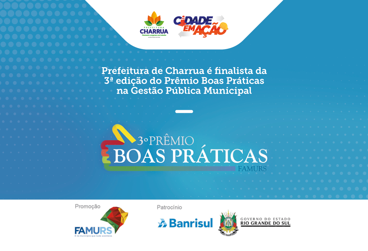 A Federação das Associações de Municípios do Rio Grande do Sul (Famurs) divulgou, por meio de sua Comissão Organizadora, que o programa “Cidade em Ação”, da Prefeitura de Charrua, está entre os finalistas da 3ª Edição do Prêmio Boas Práticas na Gestão Pública Municipal, na categoria Mobilidade Urbana e Trânsito. A divulgação da classificação final e entrega da premiação será no dia 5 de julho, em Bento Gonçalves, durante o 39º Congresso de Municípios do Rio Grande do Sul.