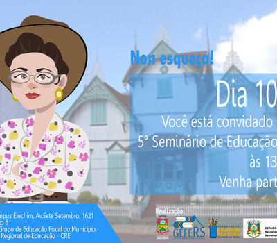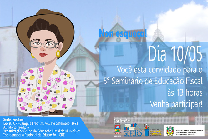 Erechim irá sediar o 5º Seminário de Educação Fiscal no dia 10 de maio deste ano, das 13 horas às 17 horas, no auditório do prédio 6 da URI – Campus Erechim, o evento tem como objetivo conscientizar os cidadãos sobre a função social dos tributos, e a importância da mesma na relação entre as pessoas e o Estado.