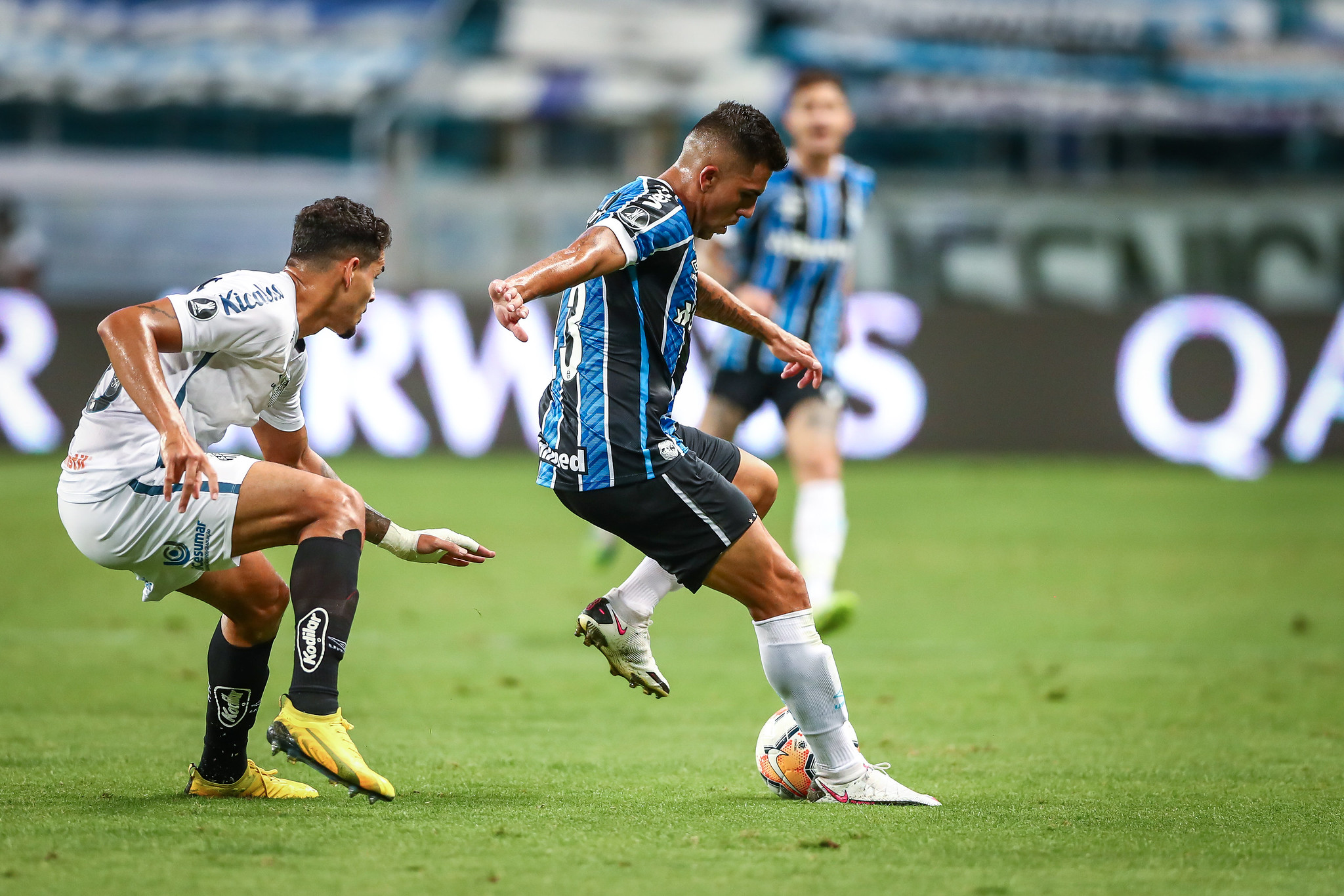 Dois minutos depois, Jobson chutou a bola em Pinares que estava caído e houve um princípio de tumulto envolvendo jogadores dos dois times na beira do campo, mas a turma do ‘deixa disso’ conseguiu controlar a situação. E aos 39 minutos, Diego Pituca fez falta em Pinares, mas o árbitro se confundiu e expulsou o jogador do Grêmio. Alertado pelo VAR, voltou atrás, retirou o vermelho e deu amarelo para o atleta santista.