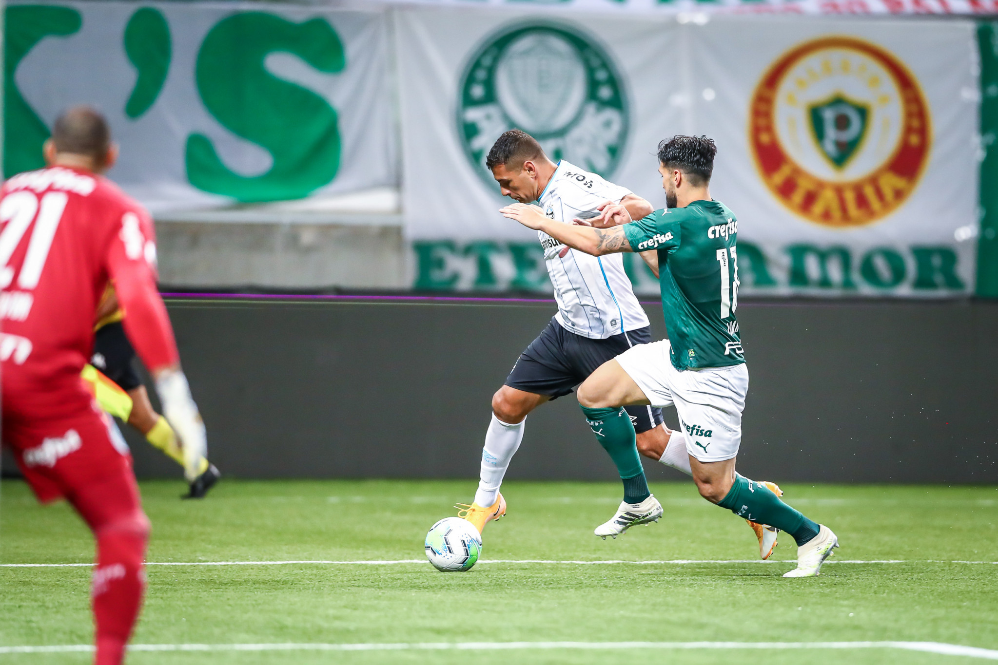 Logo nos primeiros 45 segundos, Jean Pyerre errou passe no meio campo e Breno Lopes arrancou sozinho em direção ao gol Tricolor. Vanderlei saiu nos pés do atacante e salvou. Aos 10 minutos, Marcos recebeu na área e chutou cruzado. Vanderlei se esticou e salvou de novo. Aos 16’, o goleiro defendeu um chute de Rony e aos 23’ foi a vez da trave salvar. Breno Lopes arranca pela direita e cruza rasteiro. Rony, sozinho na pequena área chutou forte e a bola atingiu o poste. Um minuto depois, Willian bateu colocado da entrada da área e outra vez a bola foi na trave. Aos 28’ Raphael Veiga mandou uma bomba de esquerda e a bola passou perto do gol Tricolor. Aos 30’, a terceira bola na trave em chute de Breno Lopes, sozinho, na cara do gol. Dois minutos depois, Matías Viña tocou rasteiro para o meio da área, Rony furou, mas Raphael Veiga aparece na sequência e livre de marcação, completou para o gol. O Grêmio seguiu disperso e aos 35’ o Palmeiras teve mais uma chance em chute de Raphael Veiga, que Vanderlei defendeu. O Tricolor só ameaçou aos 37’, em lance com Alisson, que bateu rasteiro e obrigou Weverton a mandar para escanteio.