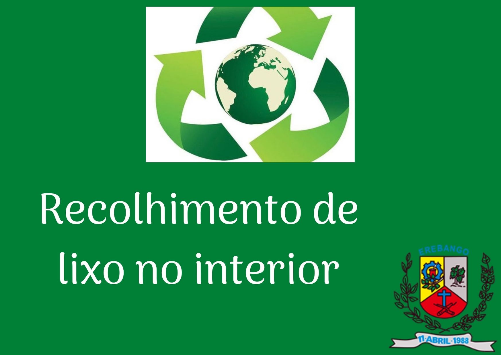 A prefeitura de Erebango, por meio da Secretaria de Agricultura - Departamento de Meio Ambiente - e Emater, informa que a coleta de lixo seco no interior, será realizada no próximo dia 17, no turno da manhã.