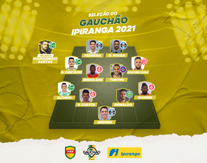 A seleção do campeonato foi composta por três atletas do Grêmio, três do Inter, dois do Juventude, um do Caxias, um do Ypiranga e um do São Luiz. Com Marquinhos Santos (Juventude) como treinador, a seleção do Gauchão Ipiranga 2021 teve: Brenno; Rodinei, Reinaldo, Cuesta e Eltinho; Edenilson, Tontini, Guilherme Castilho e Gustavo Xuxa; Ferreira e Diego Souza.