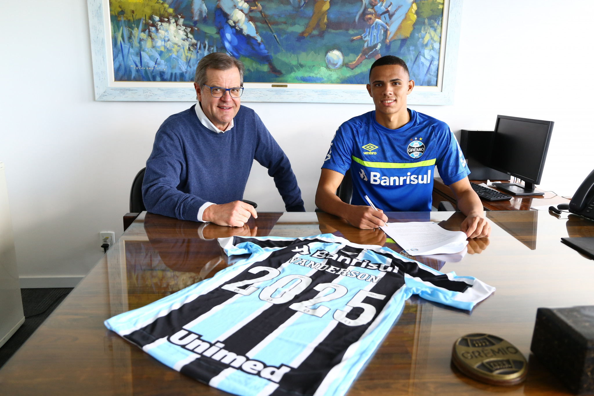 O Grêmio comunicou nesta quarta-feira (09), a renovação de contrato com o lateral-direito Vanderson. Destaque no elenco profissional, após chegar ao grupo principal na temporada passada, o atleta estende o vínculo até o final de 2025. A assinatura do novo contrato ocorreu nesta quarta-feira, no Centro de Treinamento Presidente Luiz Carvalho, e contou com a presença do vice de futebol, Marcos Herrmann.
