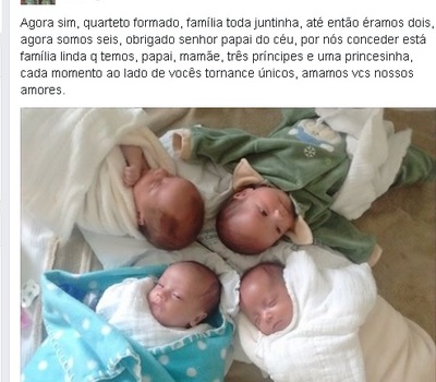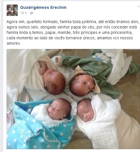 Com esta mensagem, os pais dos quadrigêmeos de Erechim, Renato de Paula e Daniela Araújo de Oliveira publicaram uma foto dos bebês todos juntinhos na página das crianças no Facebook. Até a publicação deste texto, a imagem já contava com mais de quatro mil curtidas e mais de 230 compartilhamentos.