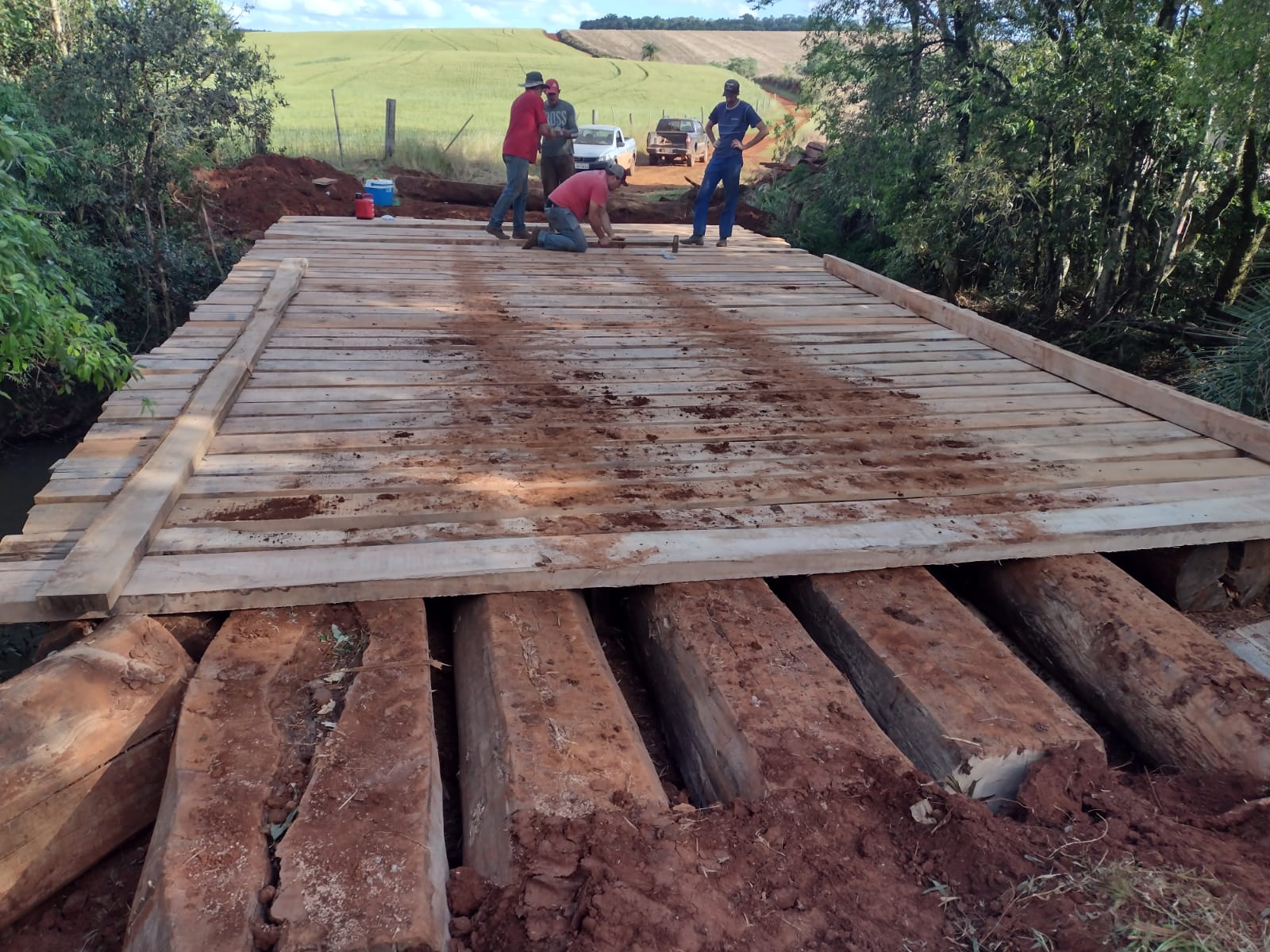 Entre as recentes atividades dos servidores das secretarias de Agricultura, Indústria e Meio Ambiente, e Obras de Erebango, está a reconstrução de pontes em duas comunidades da zona rural, próximas à área de divisa com o município de Erechim.