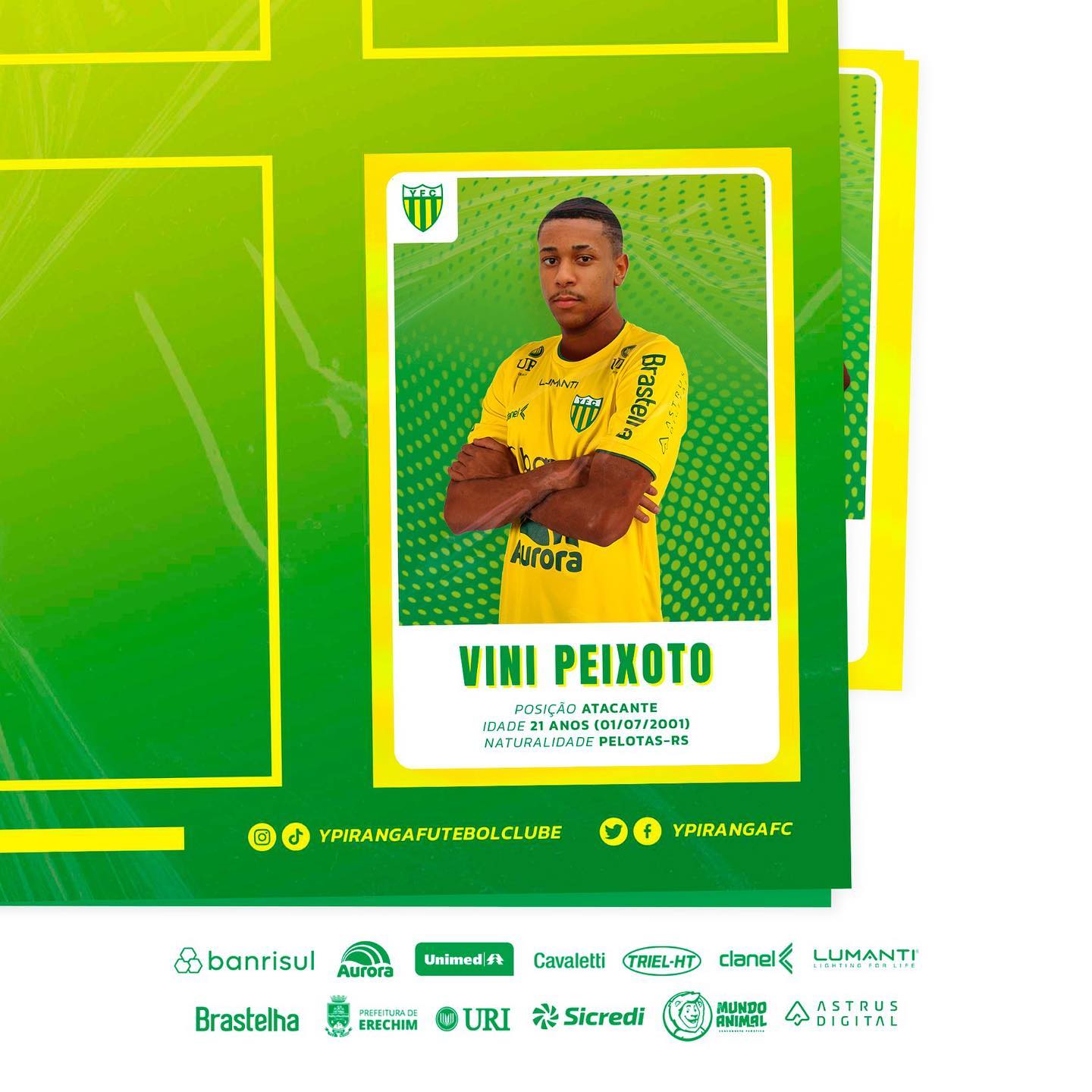 Nesta quinta-feira (6), o Ypiranga anunciou um novo reforço ofensivo, o atacante Vini Peixoto, de 21 anos, para compor o time. Na temporada, o extrema disputou o Campeonato Baiano, pelo Barcelona de Ilhéus e acumula passagens pelos clubes: Novo Hamburgo, Brasil de Pelotas e Esportivo. O jogador chega à Erechim para disputar o restante da temporada com o Canarinho.