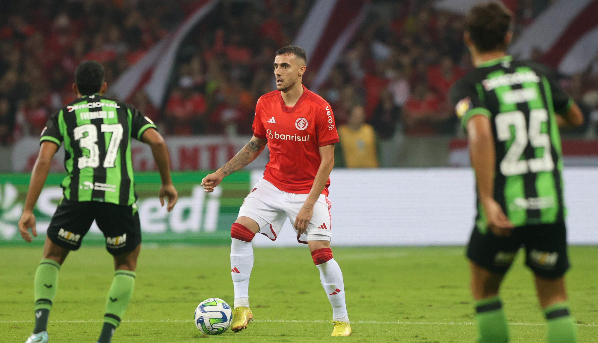 Objetivo e com maior posse de bola, os donos da casa tiveram dificuldades de chegar à frente e pressionar o América, que montou um paredão para tentar se defender. E se com a bola rolando estava difícil, a parada resolveu. Aos 19’, De Pena cobrou falta e Nico Hernández, de cabeça, abriu o placar. Aos 31’, nova cobrança de falta de De Pena e Igor Gomes se jogou na bola para empurrar para as redes e ampliar. O América teve uma oportunidade aos 40’, em cabeceio de Aloísio, que John defendeu e aos 45’, após revisão de lance no VAR, o árbitro marcou pênalti de Alê em Lucca. Pedro Henrique bateu no canto esquerdo do goleiro e alcançou o resultado que dava a classificação para os donos da casa. Final da primeira etapa: Inter 3, América-MG 0.