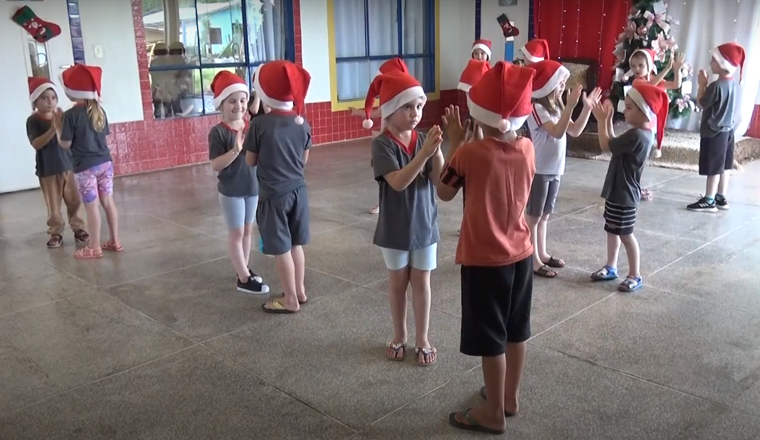 O gorro vermelho, os passinhos ensaiados e os olhos atentos em direção a professora. Uma música natalina começa a tocar no fundo do ambiente, e as crianças entram em movimento. Em parzinhos, eles colocam em prática o ritmo da dança aprendido nos últimos meses.