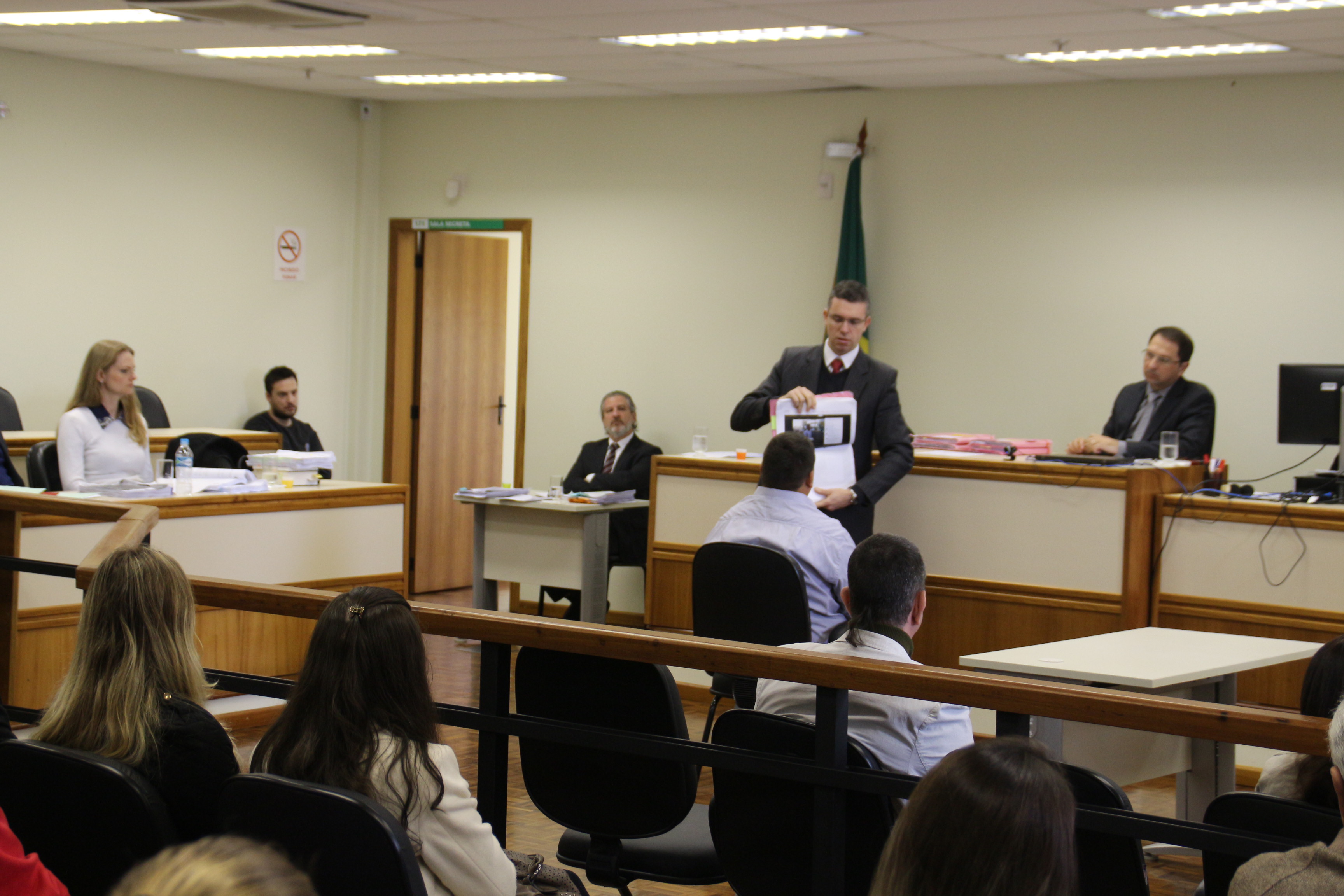 A sessão que teve início às 10h da manhã, com auditório do salão do júri, lotado de estudantes de direito, familiares e pessoas da comunidade, foi aberta com o depoimento do delegado Gustavo Ceccon, responsável pelo inquérito do caso. Durante sua fala o policial, comentou como ocorreu o processo de investigação. "Descobrimos que seis pessoas participaram da agressão que acabou com a morte, quatro menores que já foram condenados e dois maiores em que ocorre o julgamento hoje", destacou.