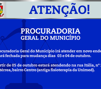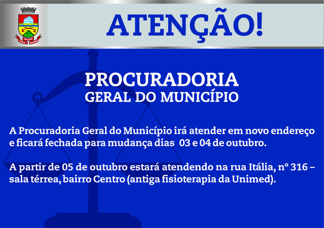O Governo de Erechim, através da Administração Pública Municipal, informa à comunidade que, para a melhoria no atendimento à população, a Procuradoria Geral do Município passará a atender na rua Itália, nº 316 – sala térrea (centro) - antiga fisioterapia da Unimed.