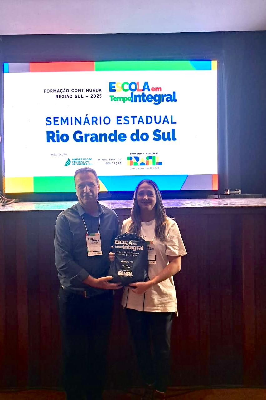 O município de Paim Filho, representado pelo secretário de Educação e Cultura, Carlos Humberto Dal Prá, e pela diretora da Escola Municipal Irmã Maria Anastasie, Carine Baldin, participaram do Seminário Estadual da Formação Continuada do Programa Escola em Tempo Integral, em Santa Maria (RS). O evento teve como objetivos discutir estratégias para a educação e reuniu gestores e técnicos das secretarias municipais de Educação do Rio Grande do Sul.
