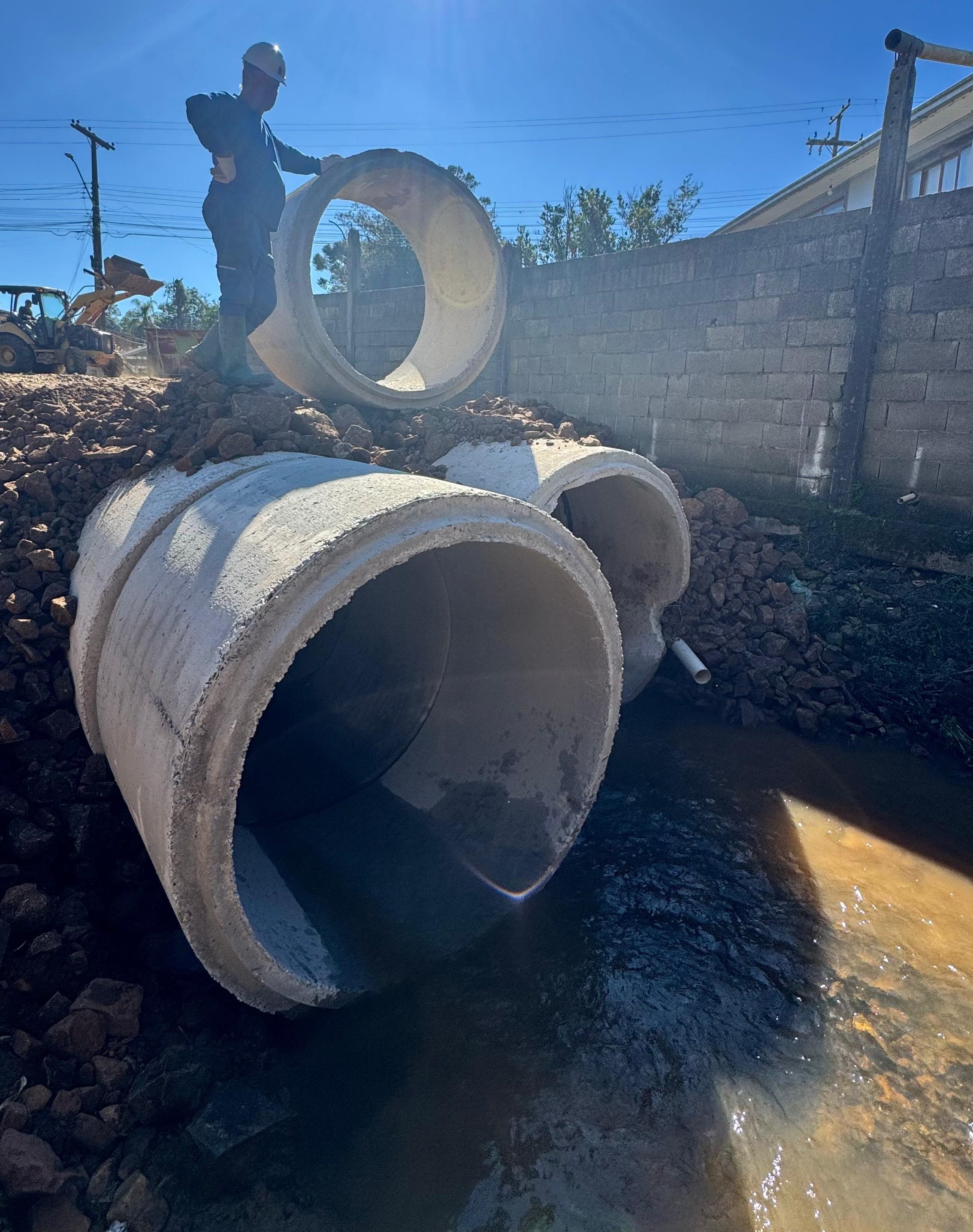 A Prefeitura de Erechim, por meio da Secretaria Municipal de Obras Públicas e Habitação, está em fase final de execução da instalação de uma nova tubulação na Rua Santa Maria, no bairro Cerâmica. A intervenção, iniciada nas últimas semanas, prevê a colocação de 70 metros de tubulação dupla com diâmetro de 1,50 metros, e tem como principal objetivo evitar os recorrentes alagamentos que atingem as residências próximas à sanga em períodos de chuvas intensas.