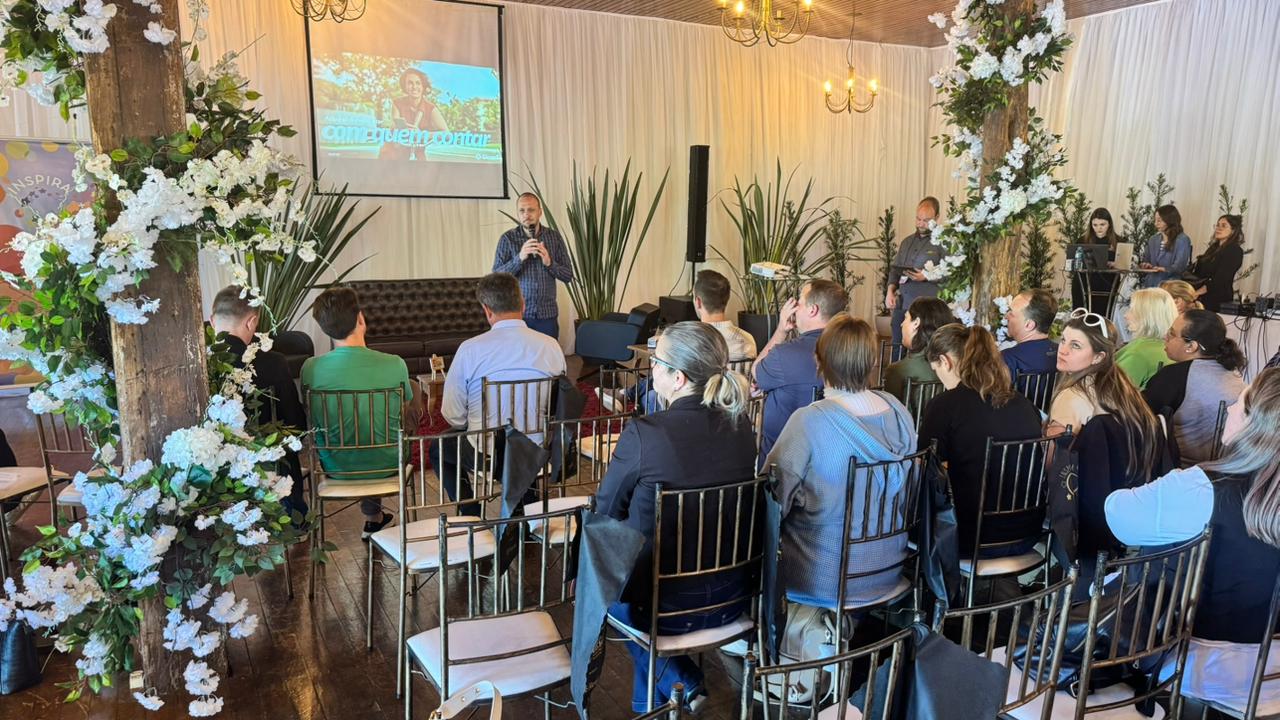 As atividades da tarde iniciaram com a apresentação sobre Linhas de Crédito para o Turismo, conduzida pelo presidente da Sicredi UniEstados, Adelar Parmeggiani e pelo gerente da Agência Empresarial, Alecsander Bertolla. O momento destacou oportunidades e ferramentas de apoio financeiro voltadas ao fortalecimento de empreendimentos e iniciativas ligadas ao setor turístico.