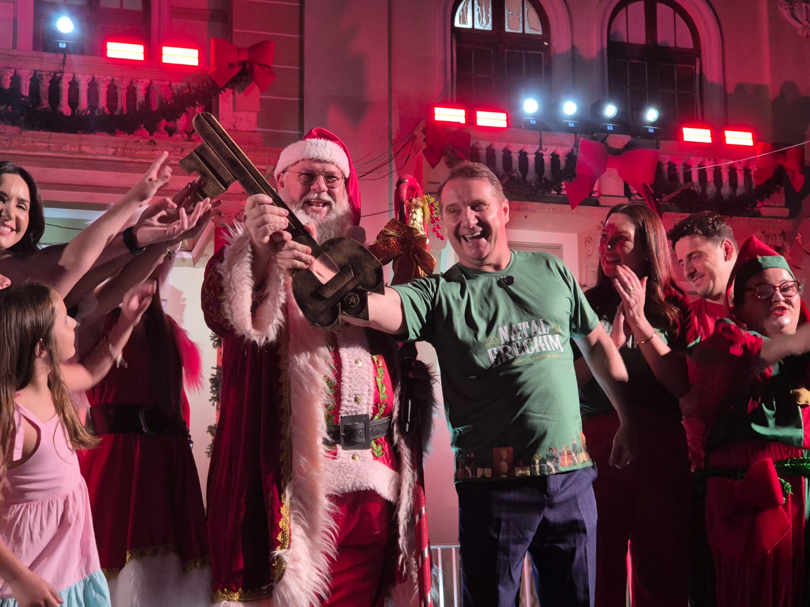 Durante a cerimônia, a Trupe Natalina marcou presença com personagens que circularam entre o público, distribuindo alegria, acolhimento e interação com as crianças. Em um dos momentos mais emocionantes da noite, a trupe invadiu o palco com música, brincadeiras e muita energia para chamar o Papai Noel, que chegou para dar início oficial à temporada natalina.