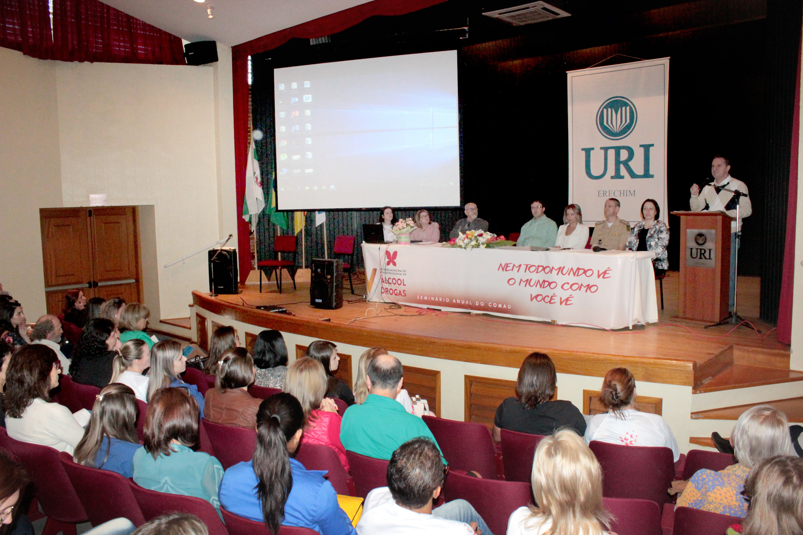 Com o slogan “Nem todo mundo vê o mundo como você vê”, a Prefeitura de Erechim, através da Secretaria de Segurança e Secretaria de Saúde - Centro de Atenção Psicossocial em Álcool e Outras Drogas (CAPS AD) e do Conselho Municipal de Políticas Públicas em Álcool e Outras Drogas (COMAD), promovem o V Encontro de Atenção Psicossocial em Álcool e Drogas e Seminário Anual do COMAD, nos dias 24 e 25 de novembro. Os eventos acontecem no Salão de Atos da URI e a abertura oficial foi realizada na manhã de quinta-feira (24) pelo prefeito de Erechim, Paulo Polis.