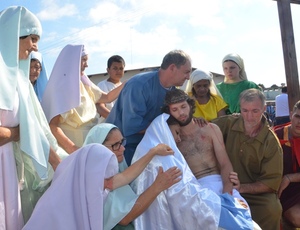 Celebração da paixão de Cristo reuniu pequena multidão na Praça Jayme Lago