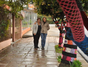 Árvores enfeitadas com crochê atraem a atenção de quem passa por rua do centro de Erechim